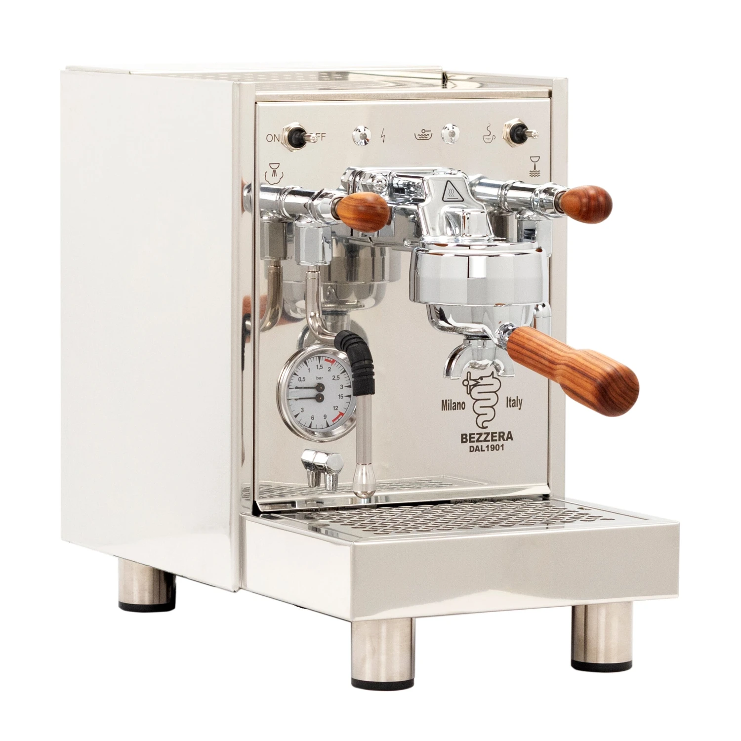 It may be little, but it’s anything but a wimp. The electrically heated group offers some essential temperature stability, and the double manometer on the front of the machine is convenient for monitoring your extraction. The rosewood accents offer a more distinguished look.