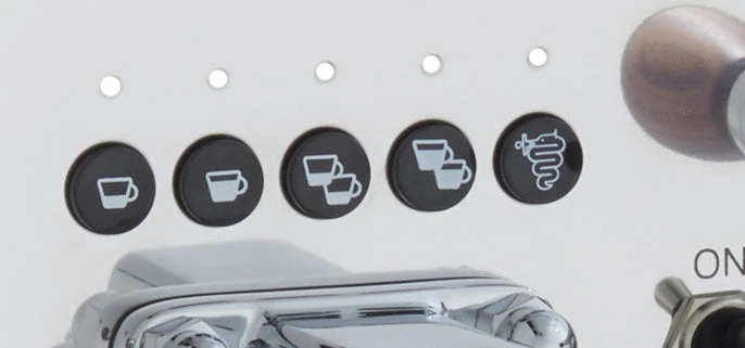 The Bezzera DUO DE features the same automated preinfusion as found on the Matrix DE model, and operation is the same. Brewing is easy using the intuitive push button and toggle operation; each function designated by a stylized icon. Steaming too, the DUO DE’s rosewood steam knob toggles on for powerful steaming, and flipping it up locks it into place for an uninterrupted stream.