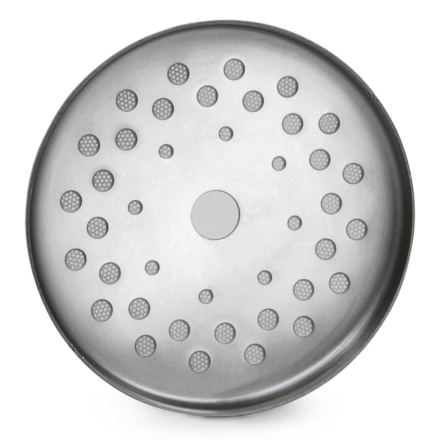 Designed with a significant redistribution and reduction of surface holes, the screen seeks to address the issue of puck degradation that can occur as a result of water forming an aggressive stream in the center. This is often caused by the presence of the shower diffuser screw. By placing a small grouping of holes near the otherwise bald center of the screen, and a wider distribution around the outer edge.