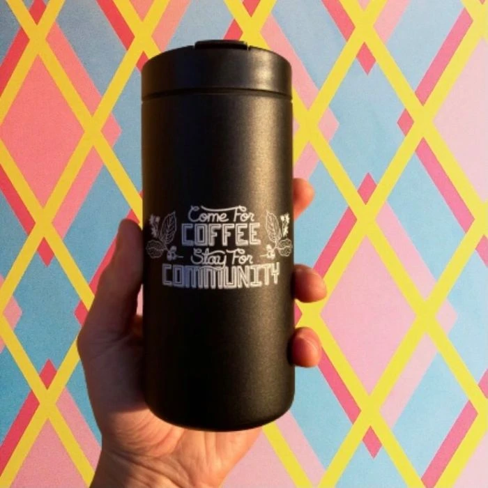 Whether you enjoy your coffee on the go, or just want to keep it hot (or cold) around the house, the Fuego Coffee Roasters tumbler has got you covered. This 12 oz insulated stainless steel tumbler is decorated with the Fuego logo and with the words “Come for the Coffee, Stay for the Community” and features art by Rochester local artist CW Brackett.Â